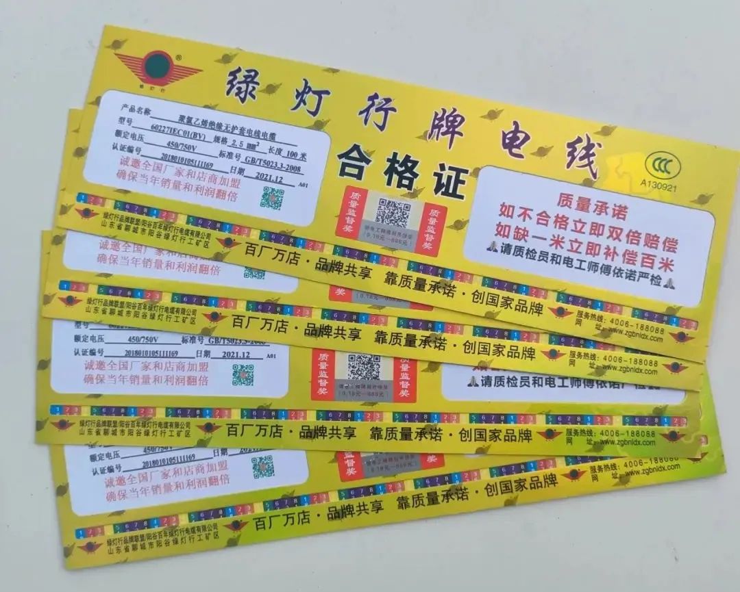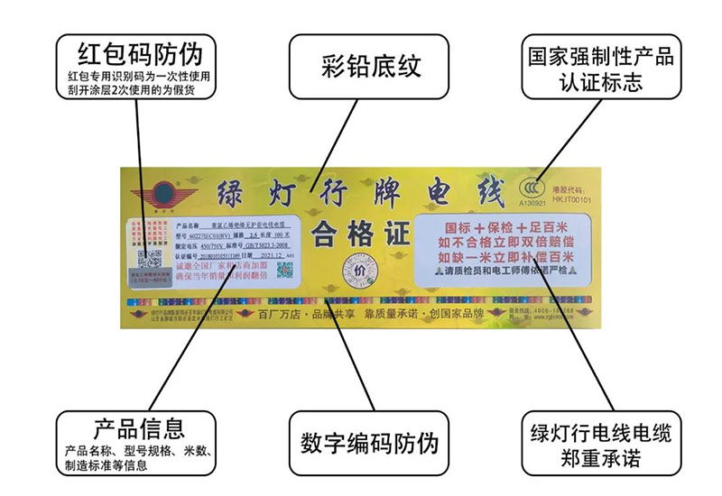 綠燈行電線產品合格證具有彩纖防偽標識,明確的3c認證標志。