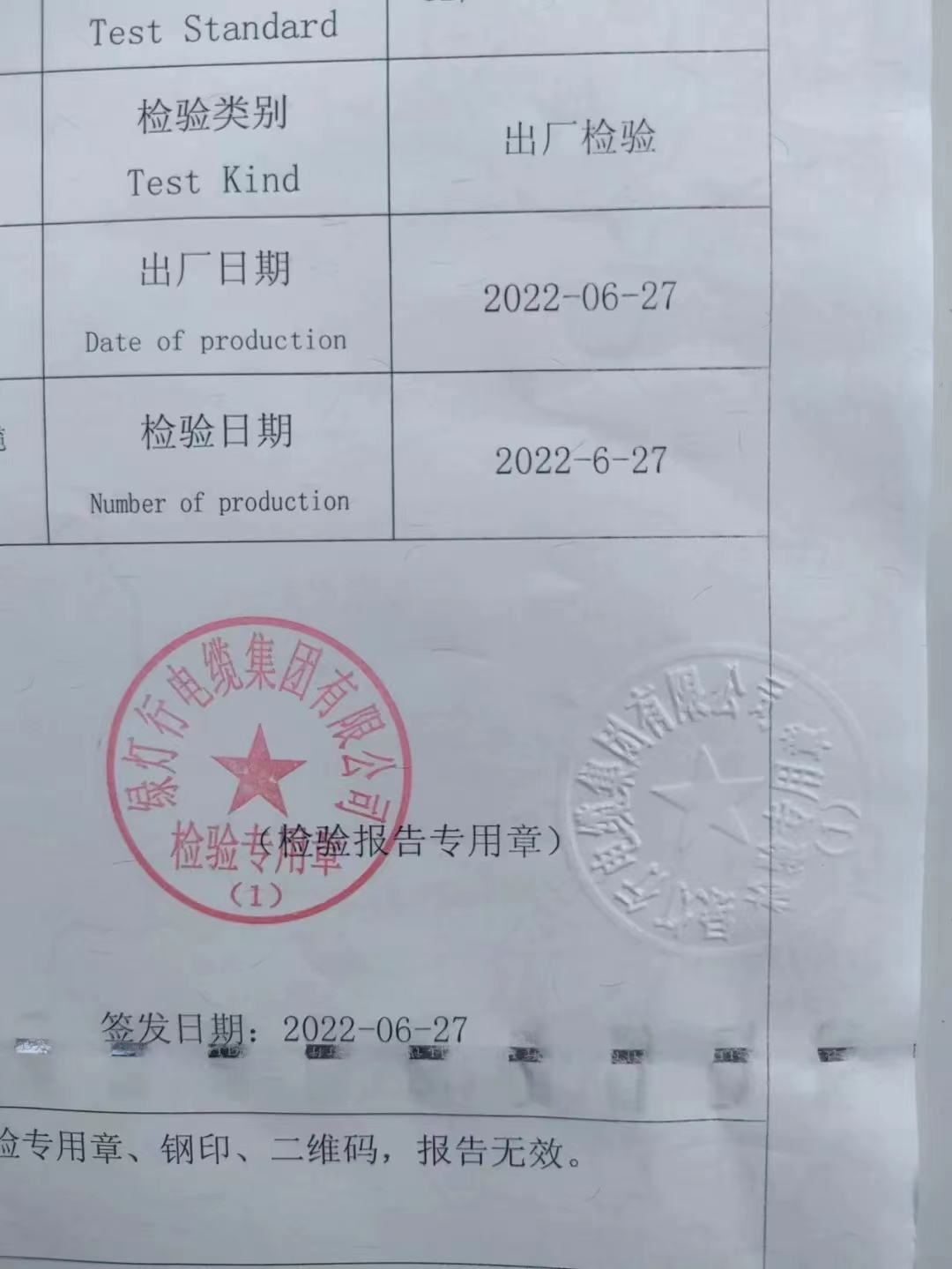 綠燈行電線電纜產品檢驗報告均加蓋鋼印標識。