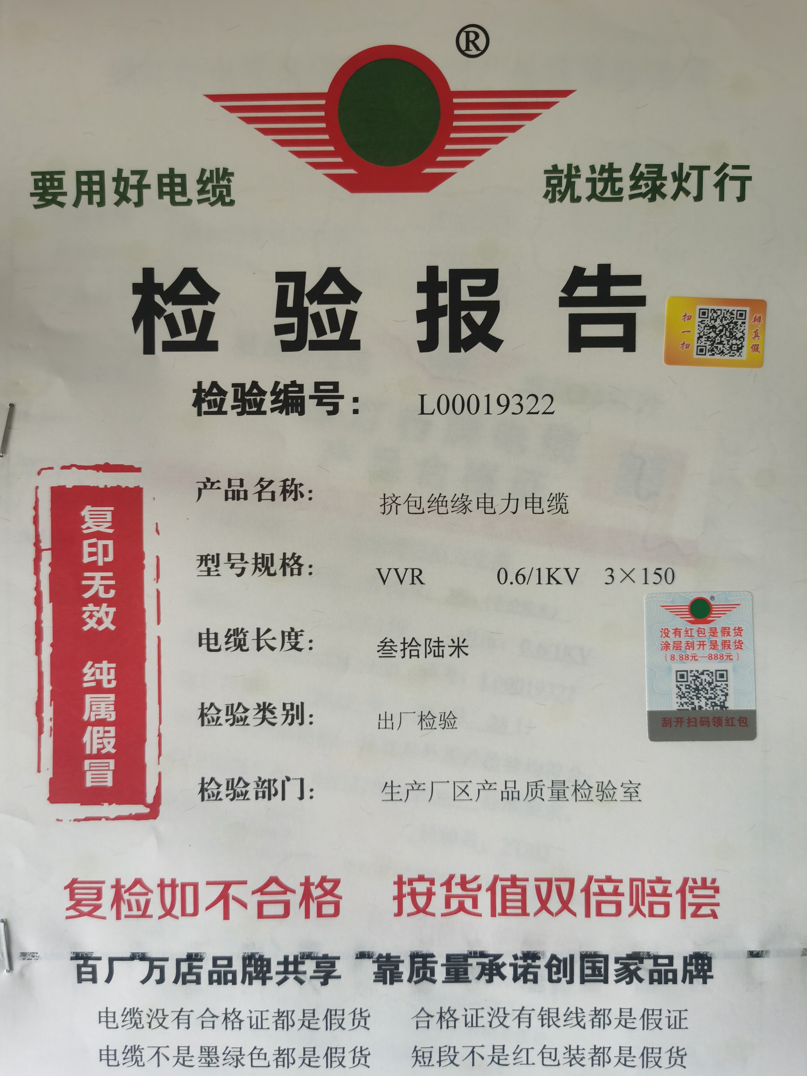 綠燈行電線電纜產品檢驗報告封面的防偽紅包碼和防偽二維碼,銀線暗紋。